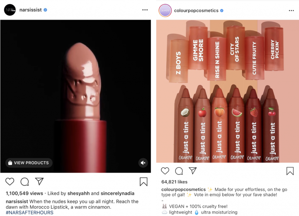 The Instagram posts above are both of lipsticks but from different brands (Nars and Colourpop, respectively), with a different target audience. Notice the difference in the captions? One is evidently meant for a mature group, while the other for Millennials – with words used like ‘gal’, ‘vegan’ and the use of emojis.